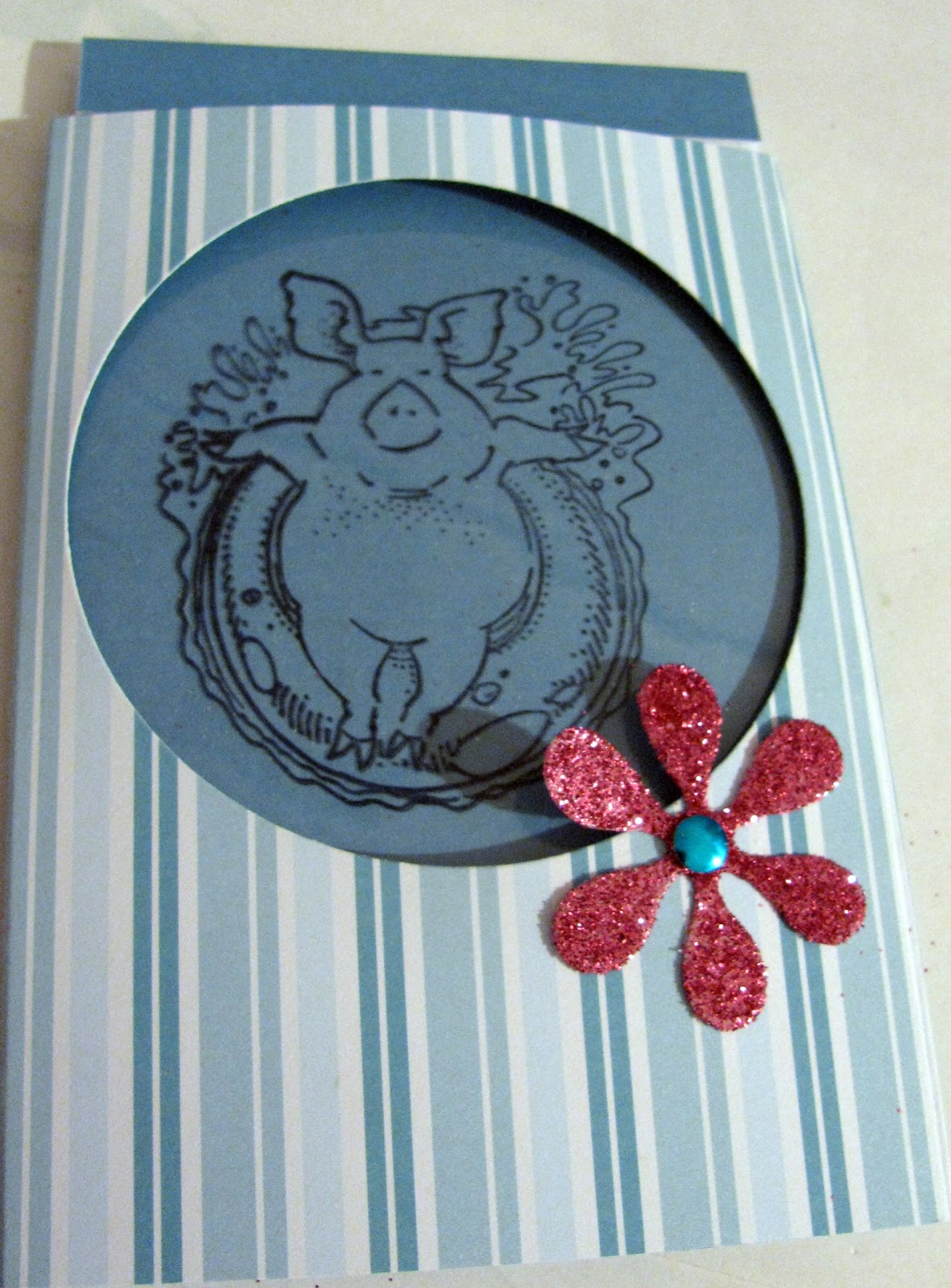 The final steps: Insert your image panel so that the acetate piece is in the front slot and the colored image piece is in the aback slot. Attach your glitter flower (or other) embellishment to the card front.